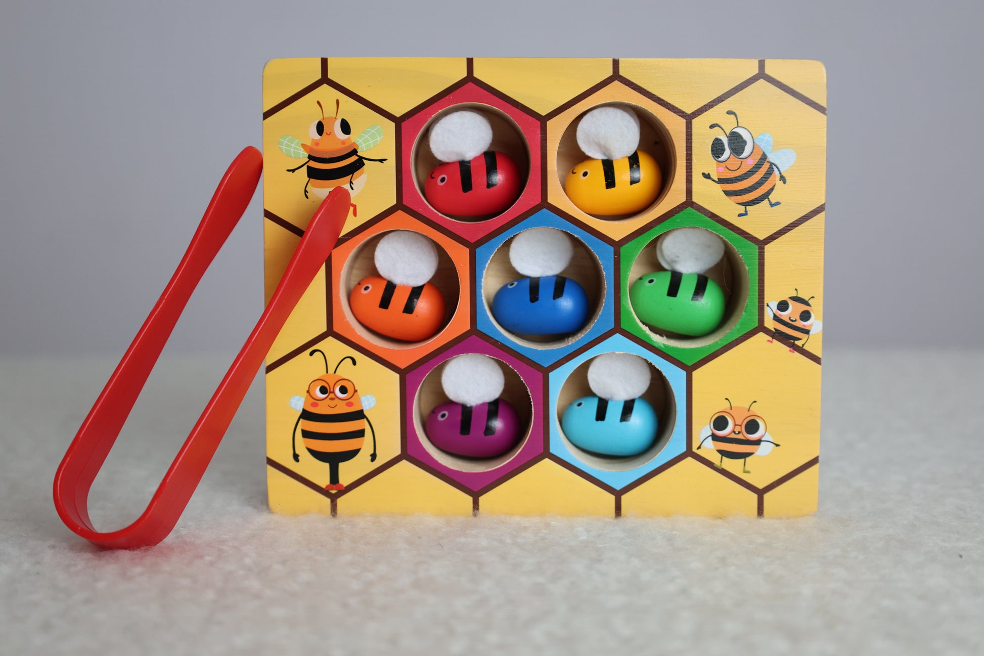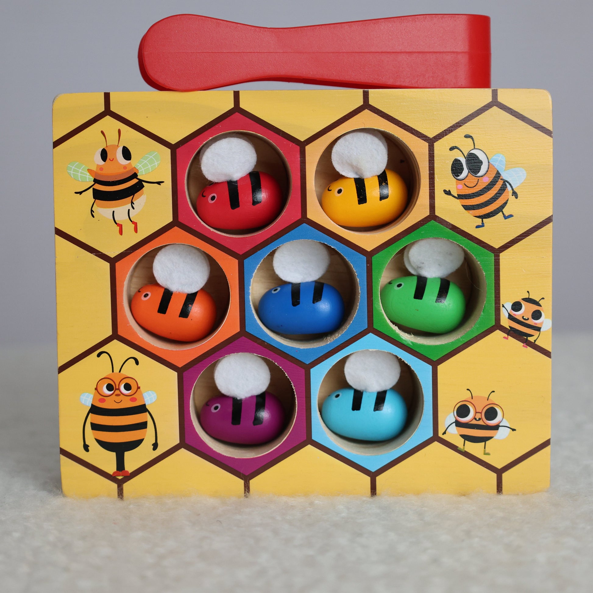 Brinquedo Montessori de madeira para desenvolvimento cognitivo e motor. Ajuda na classificação de cores e coordenação motora fina. Material seguro e durável, ideal para aprendizado interativo.