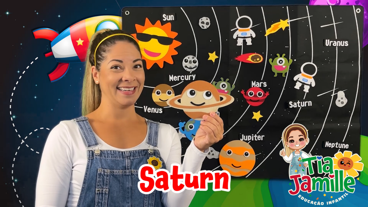 Brinquedo educativo Montessori com tema espacial, um feltro do sistema solar com planetas pendurados. Ideal para contação de histórias e aprendizado STEAM, estimulando a curiosidade sobre o universo.