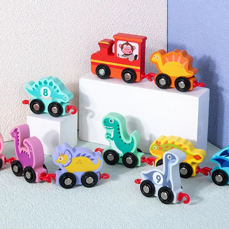 Trem divertido em madeira com figuras de dinossauros – estimula a criatividade, coordenação e o reconhecimento de cores e números em dinos de forma segura e envolvente.